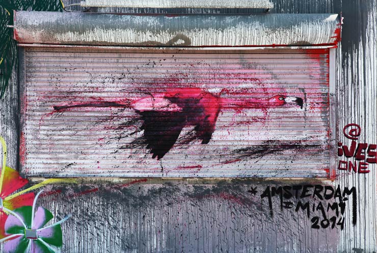 Amsterdam based Ives One was splashing and splattering and dripping his way through some Miami walls last week and rendered a few of the iconic feathered friends as long as the sun was shining. Wait, the sun is always shining there, isn’t it?