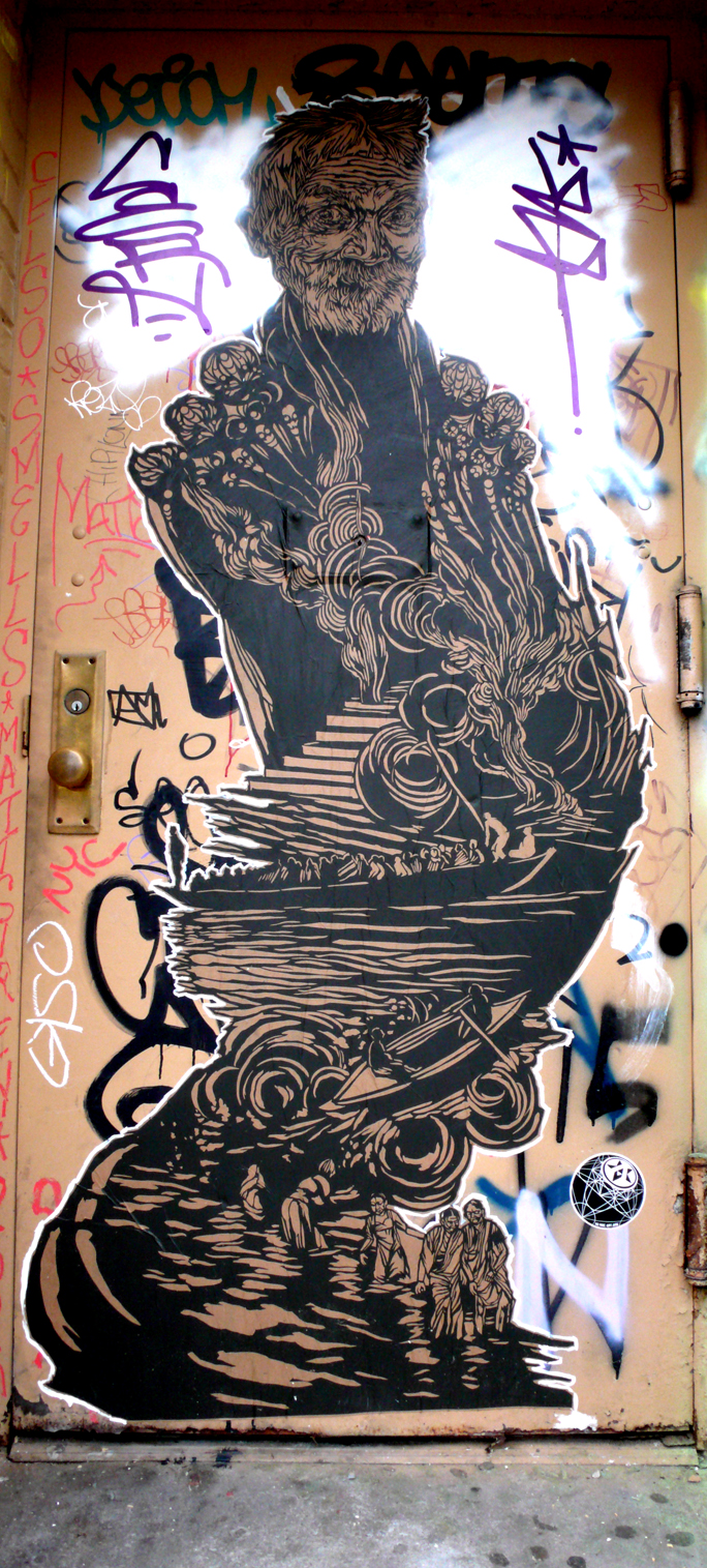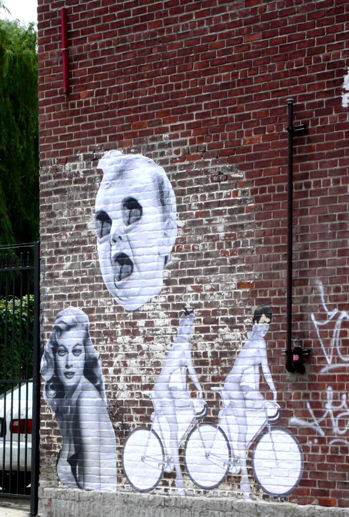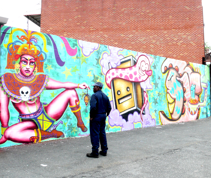 The Welling Court Mural Project was one of the most cohesive “community” events we’ve seen in a long time. Street Artists plus an engaged neighborhood of very nice people… delicious home-made foods, music from Latin America and India/Pakistan, adults, kids, painting, asking and answering myriad questions, posing for pictures in front of pieces — all proving again that the arts can bring people together. A sincere “Thank you” to Ad Hoc and Allison and Garrison and all the artists for putting your best out there for others to share.