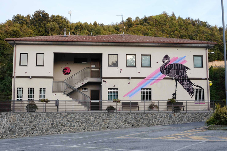 The mural is in Roccavignale, a small village in the mountain between Piedmonte and Liguria with 750 inhabitants and hosts 20 migrants. Like many Street Artists these days, immigration is a theme that has captured Opiemme’s attention and has always been in love with the written word, with the the majority of her works spread across Italy.The outlines of this multi-bird body contain a poem about migration outside the main entrance of this Kindergarden/nursery school in Fenigruottero Cirogna,