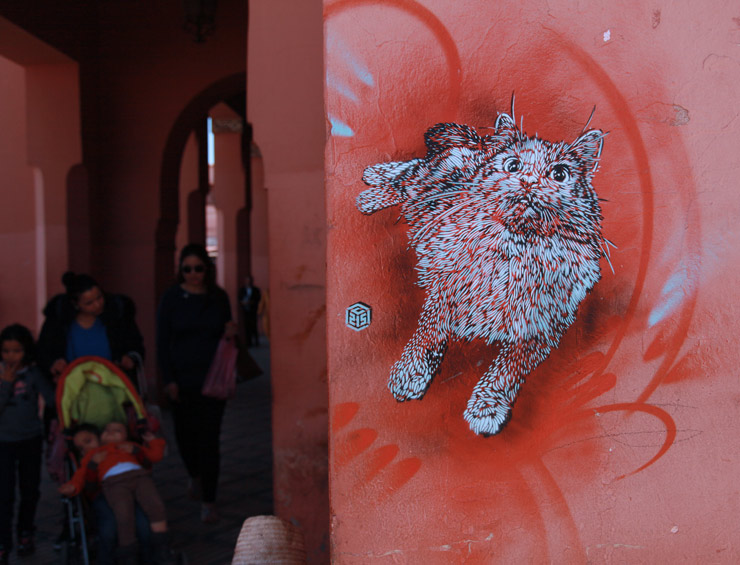 Our top image: C215 at The Medina, Djama El Fna Central Square in Marrakech. (photo © Jaime Rojo) In the prolific work of French master stencilist C215 cats appear with some regularity. It is very fitting then to have found this kitty in the wild in a city where hundreds of cats roam the streets without a particular home to go to. While not officially kept as pets the cats are being fed next to doorways. Many of them struggle for food and are visibly in need of some medical care but you will see very some happy felines comfortably bathing under the warm Moroccan sun.