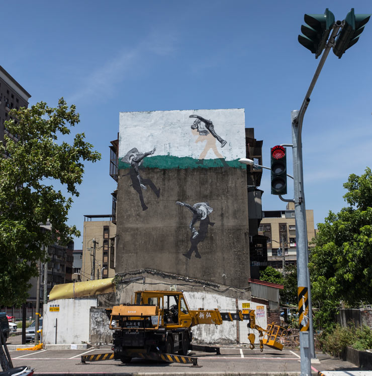 Here Norway’s Strok brings them to a wall at Hsinchu International Land Art Festival in this Taiwanese city known for being very windy. He’s been experimenting with perspectives and angles on the figure and here he brings the classic bboy move to the wall to defy gravity and fly through the air.