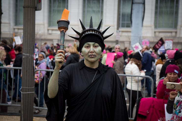 Here the Statue of Liberty is portrayed as silenced. Women’s March On Washington, DC. January 21, 2017. (photo © The Dusty Rebel)