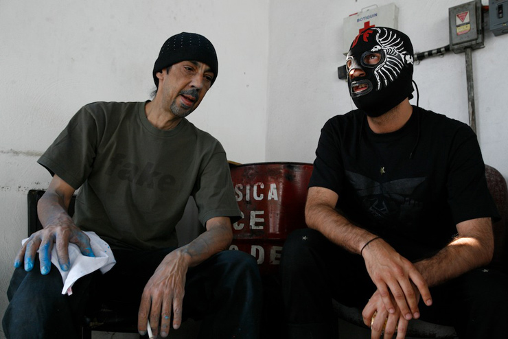 Futura talks with XGutetto 666 (in the luchador mask) during a break from painting. (photo © All City Canvas)