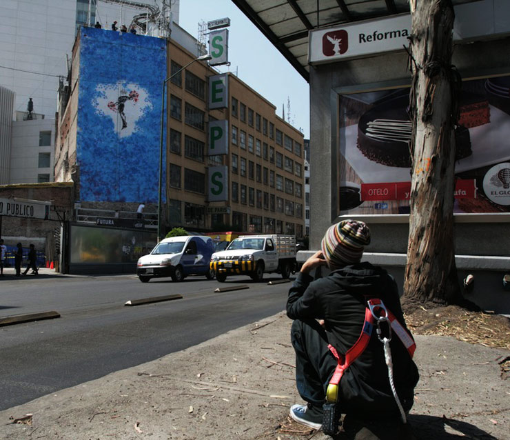 Strapped up and ready to climb the wall, Futura marches across the street in Mexico’s capital. (photo © All City Canvas)