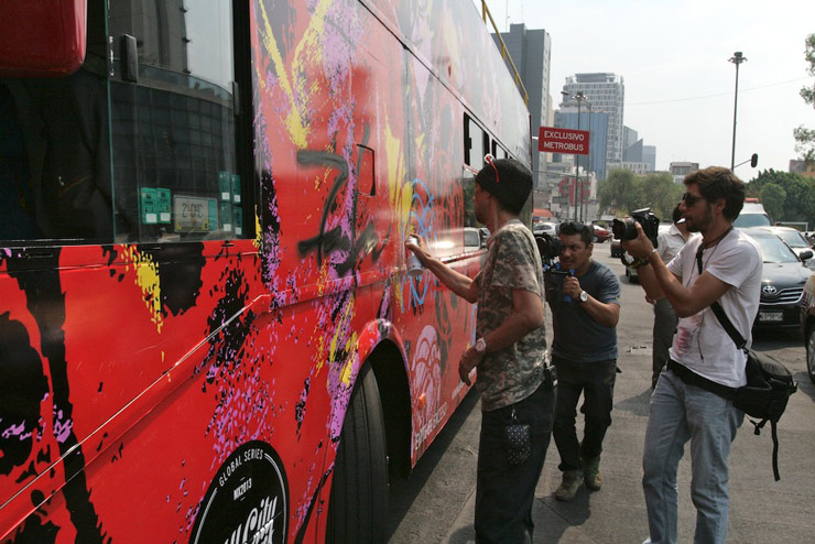 Brooklyn’s own FUTURA just visited Mexico City and here we have a few pics of him working on a new wall there. The graff master and abstract fine artist has reached such celebrity status that just showing up and being his humble charming self makes a lot of people in the graffiti and Street Art scene really happy. When he collaborates on a project with cans, as he did here with Mexican artist XGutetto 666 (from Da Flow Team) it’s even better.